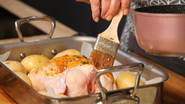 Почистете пилето и с помощта на четка го намажете отвътре с билковото масло.